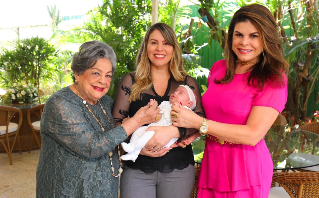 • Filha da advogada e empresária Deborah Brito Menna com o hoteleiro Rafael Menna, o bebê virou o centro das atenções do clã. Quatros gerações de mulheres reunidas de uma família que faz a diferença na capital. Tradição que tudo indica que será levada adiante através da nova integrante, que tem ganhado em especial o carinho da avó Janine. Recém-chegada de Nova York, para onde costuma ir, Janine trouxe inúmeros mimos para a neta.